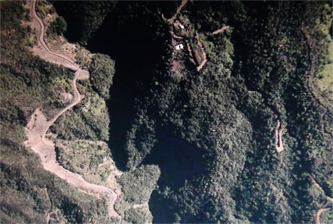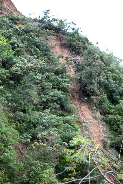 La photo 1 donne une idée de la masse de terre dégagée pour une piste de 3m de large et de son instabilité. La photo 2 montre les atteintes à la forêt primitive en contrebas de la piste..