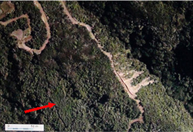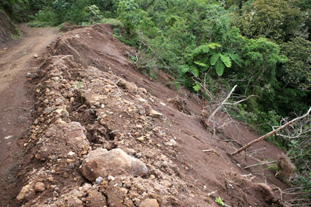 L’intervention lors de l’aménagement de chemins, aboutit à des atteintes de plus en plus importantes à l’identité du site. Compte tenu des fortes pentes, la terre de fouille repoussée sur le côté de la piste glisse sur une importante superficie de forêt primitive qu’elle détruit. L’espace déstabilisé est inévitablement colonisé par une végétation secondaire constituée en partie d’espèces envahissantes qui, à partir de là, coloniseront la forêt primitive environnante et l’étoufferont.